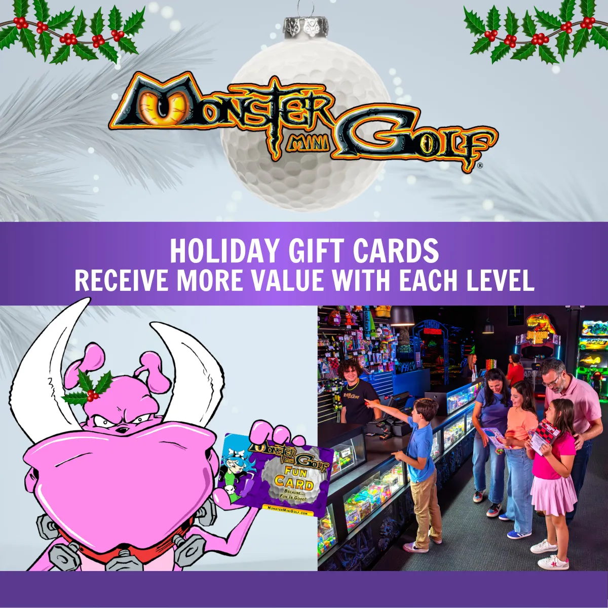 With each Monster Mini Golf Holiday Gift that you purchase, you will receive additional Gift Card value for more Monstrous Fun. Additional increases as you purchase higher value Gift Cards.